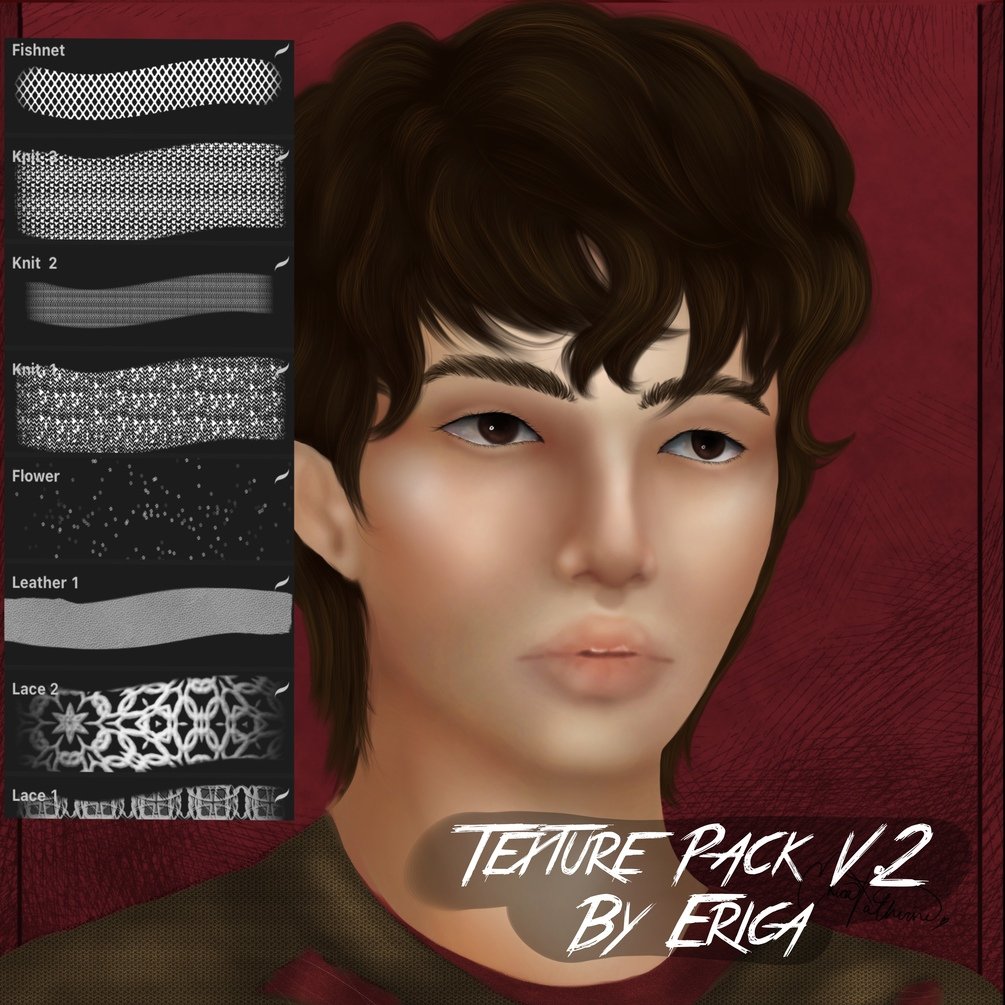 You will get 17 custom brushes, including: 2 lace brushes, 1 leather brush, 1 flower brush, 3 knit brushes, 5 fishnet stockings brushes, 3 checkered brushes, 1 fabric brush, 1 necklace base brush